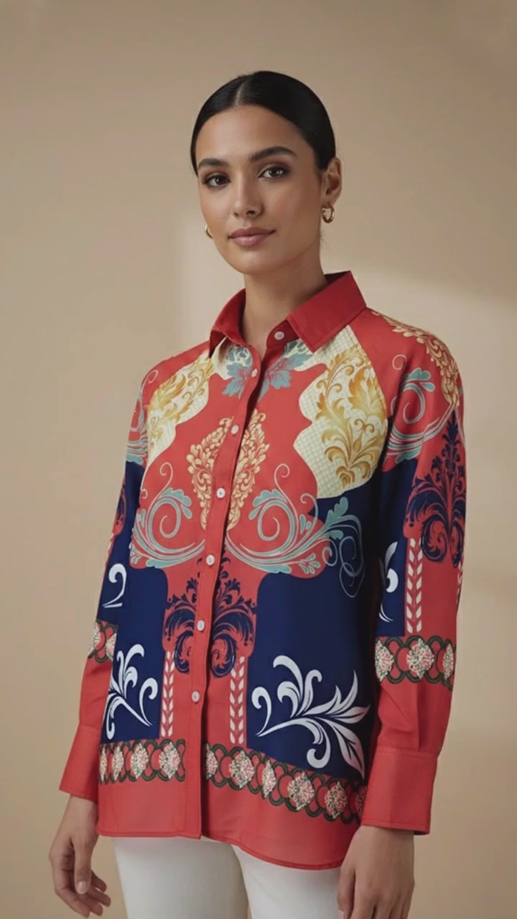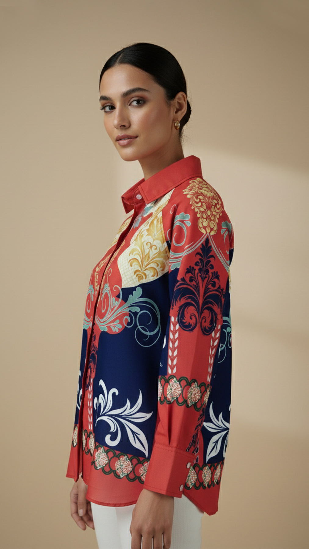 قميص ماركويزا بأزرار أمامية يجسد الفخامة الراقية بتباين ألوانه الغني وتفاصيله المستوحاة من فن الباروك. صُمم ليبرز بإطلالة أنيقة بلا مجهود، ويمزج بين الحس الفني والأناقة الكلاسيكية. قطعة مميزة للنساء اللواتي يقدّرن الإطلالة الجريئة والثقة والرقي العصري.